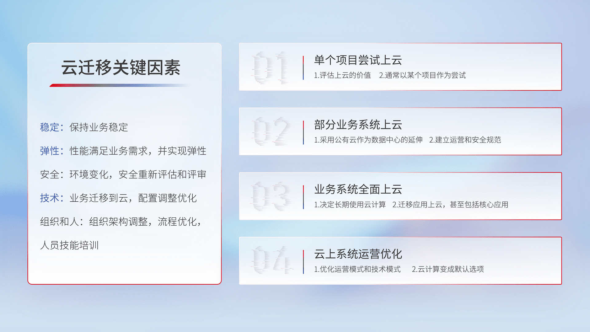 结合实际业务,,,从规划设计、、、、云平台选型、、、云原生改造、、数据迁移、、集成交付,,,,迁移全过程为客户识别最佳上云路径,,,,做好风险识别管理,,,设计网络架构、、、身份权限、、、、安全审计合规、、、操作审计、、日志审计、、、监控告警策略、、多站点容灾设计等,,,对云上基础设施进行整体规划,,,,提升IT治理水平,,,,以满足弹性、、、高可用、、高性能的需求。。。